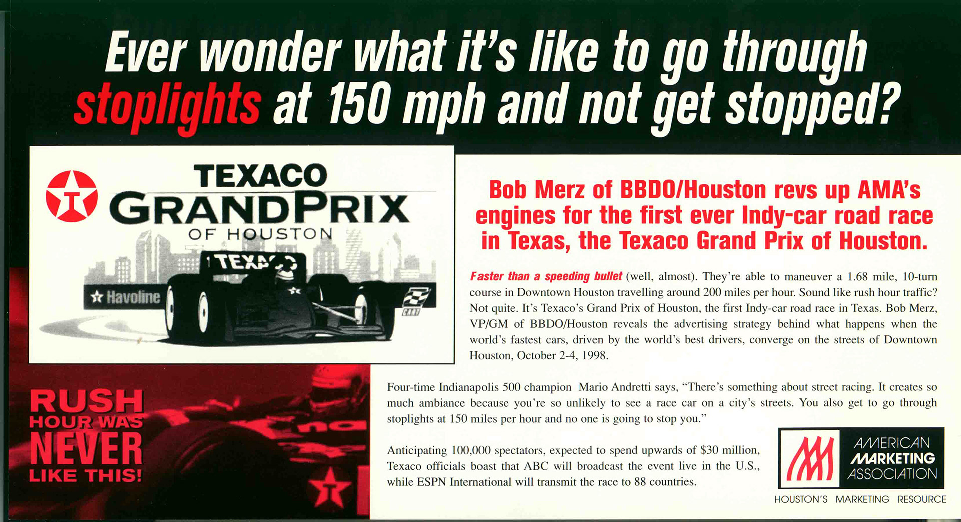 This was a promotional postcard/mailer designed for a professional luncheon of the American Marketing Association Houston where the Texaco Grand Prix was promoting their upcoming race in downtown Houston.