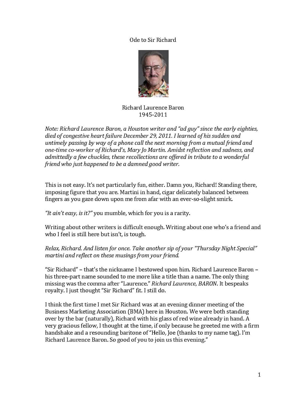 Ode to Sir Richard: My Friend, Richard Laurence Baron